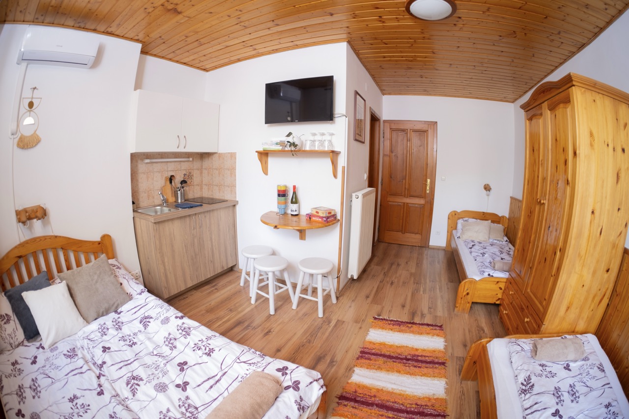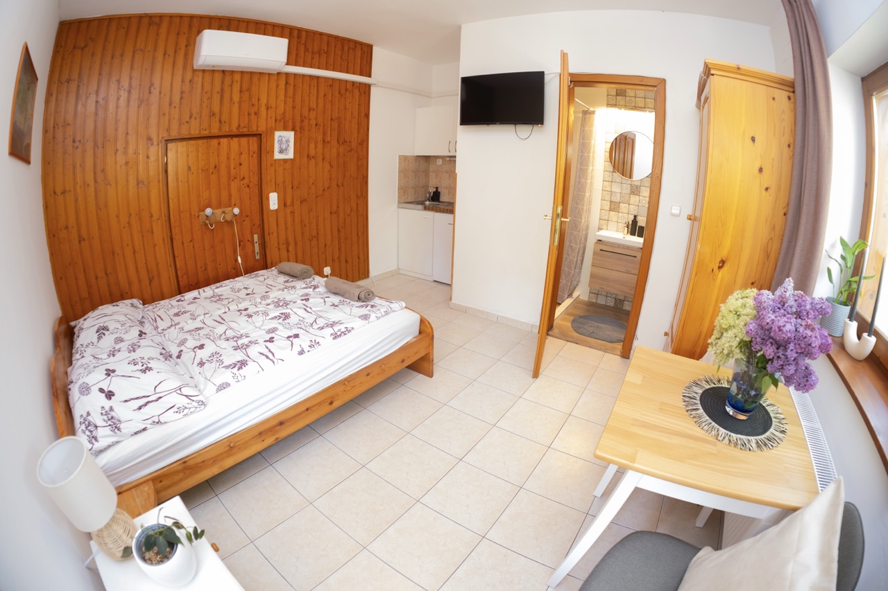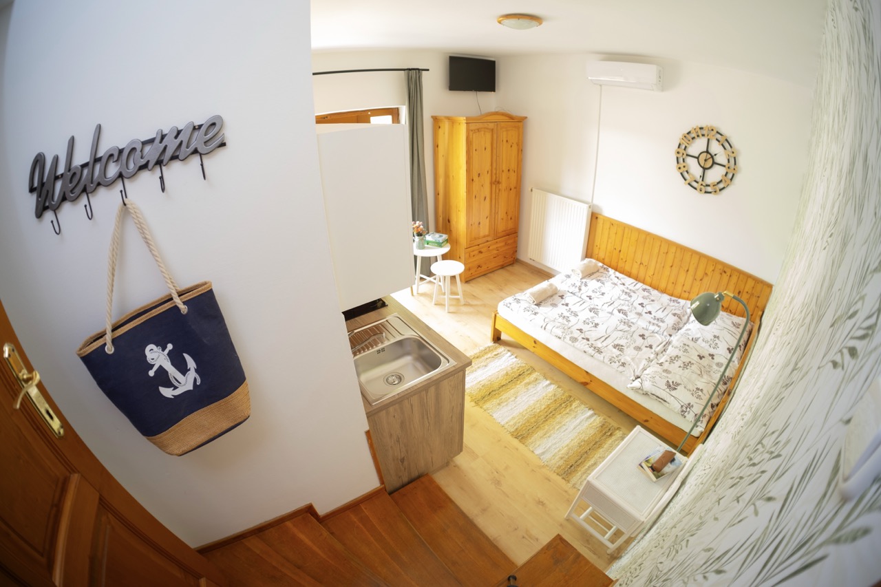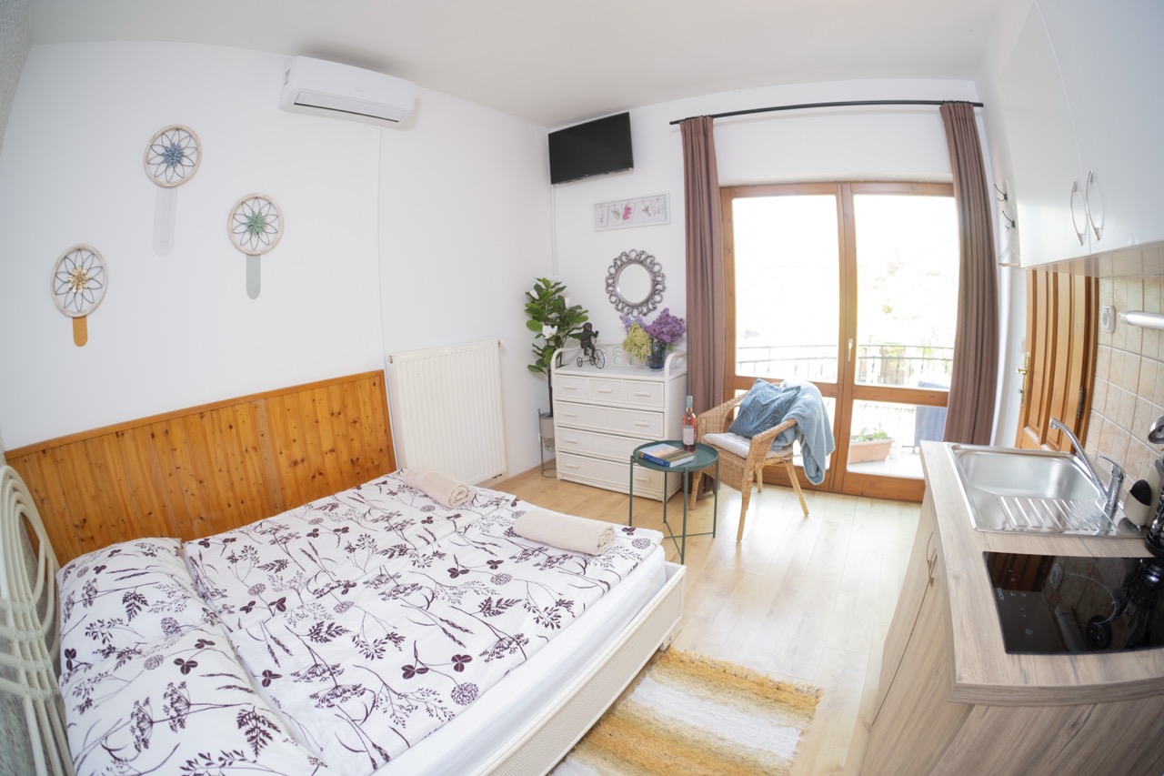25 m2, franciaágy +2 külön ágy, mini-konyha, zuhanyzó, wc, klíma, saját balkon