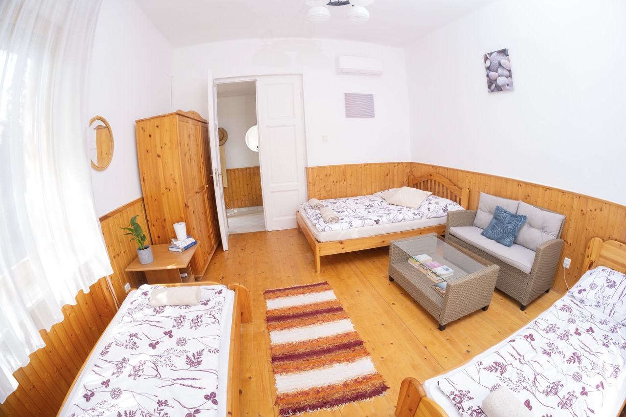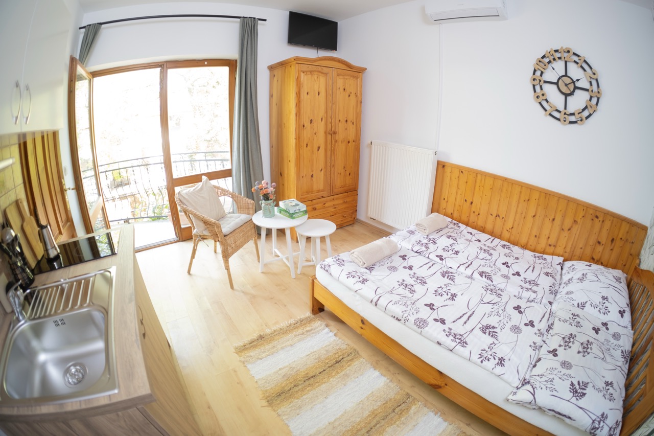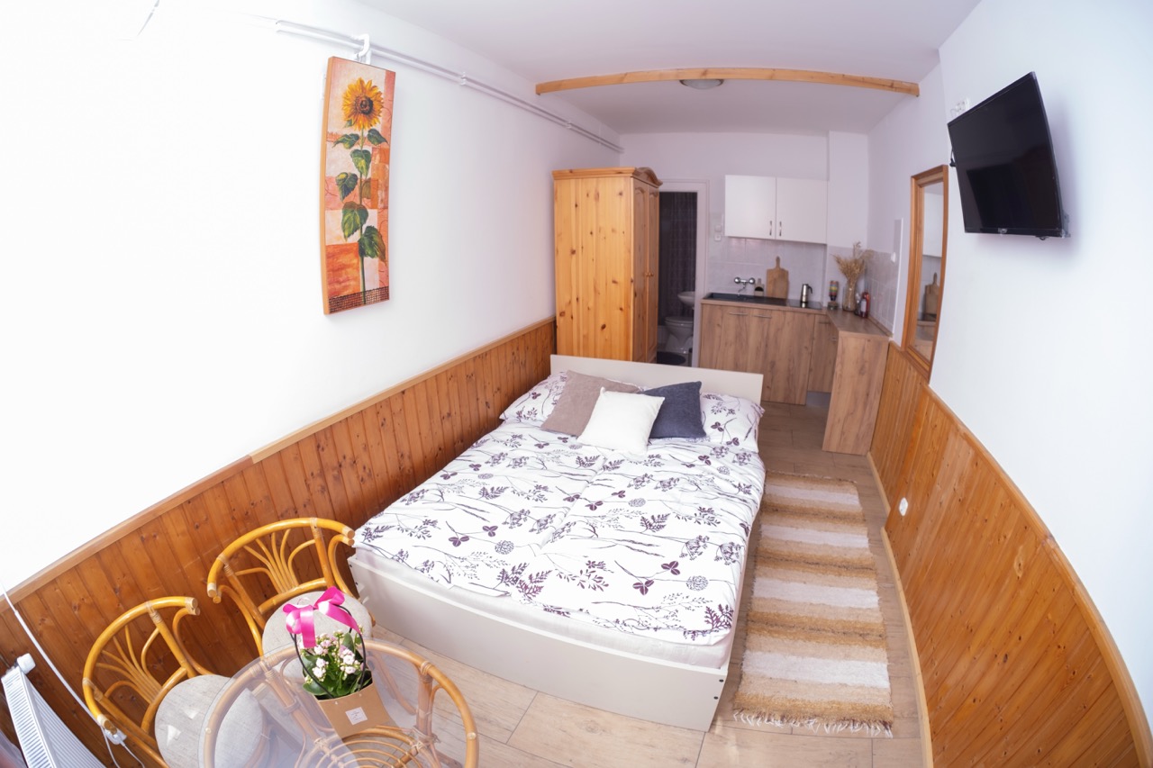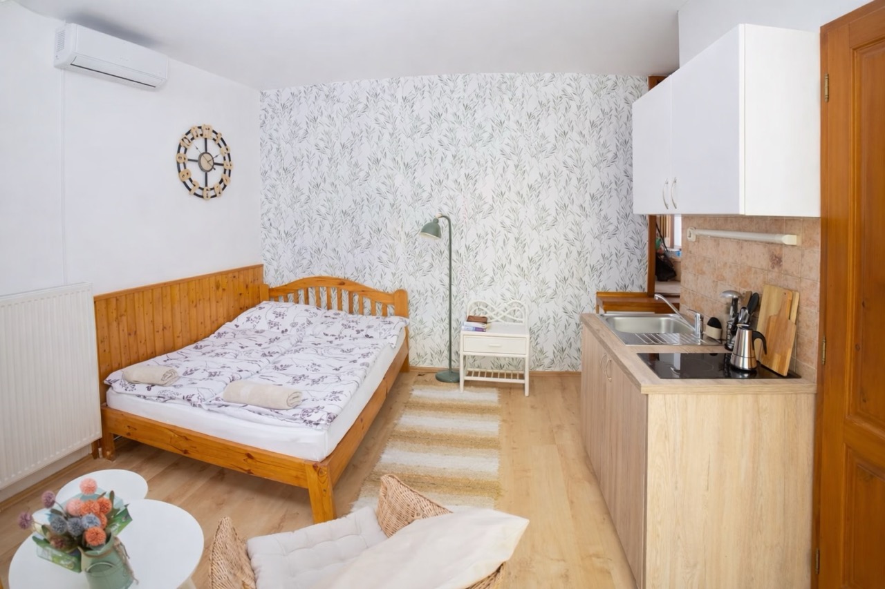 25 m2, franciaágy +2 külön ágy, mini-konyha, zuhanyzó, wc, klíma, saját balkon