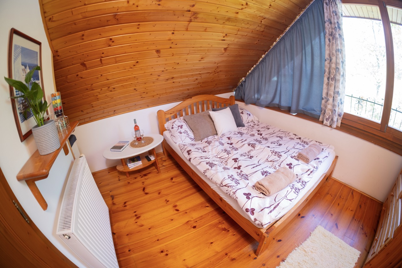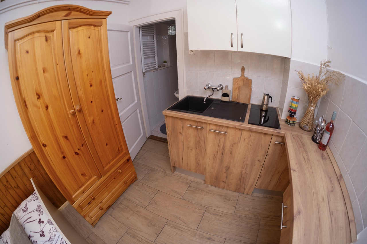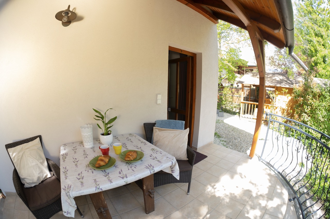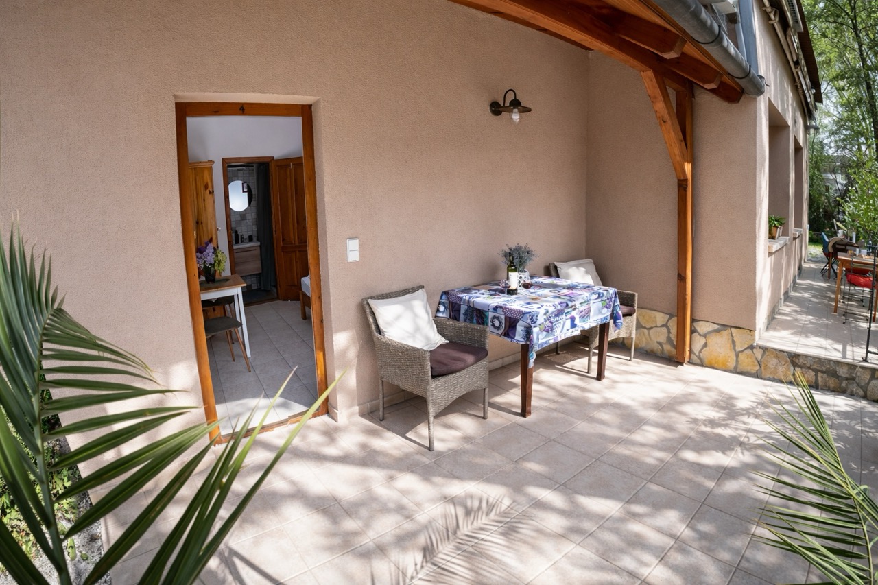 15 m2, franciaágy, mini-konyha, zuhanyzó, wc, fedett terasz rész
