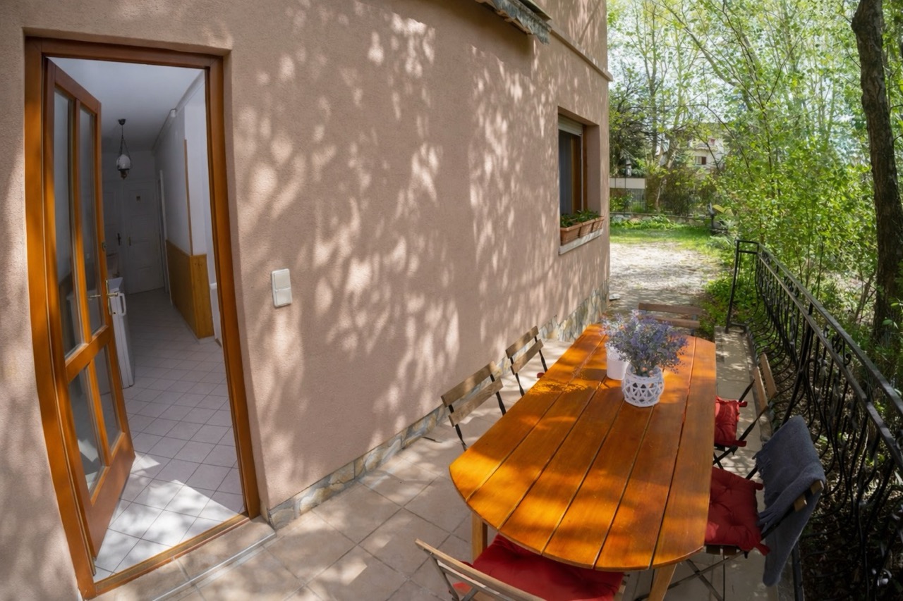 60 m2, két külön bejáratú nagy szoba, konyha, fürdőkádas fürdőszoba, külön tusoló, két wc, fedett terasz rész.